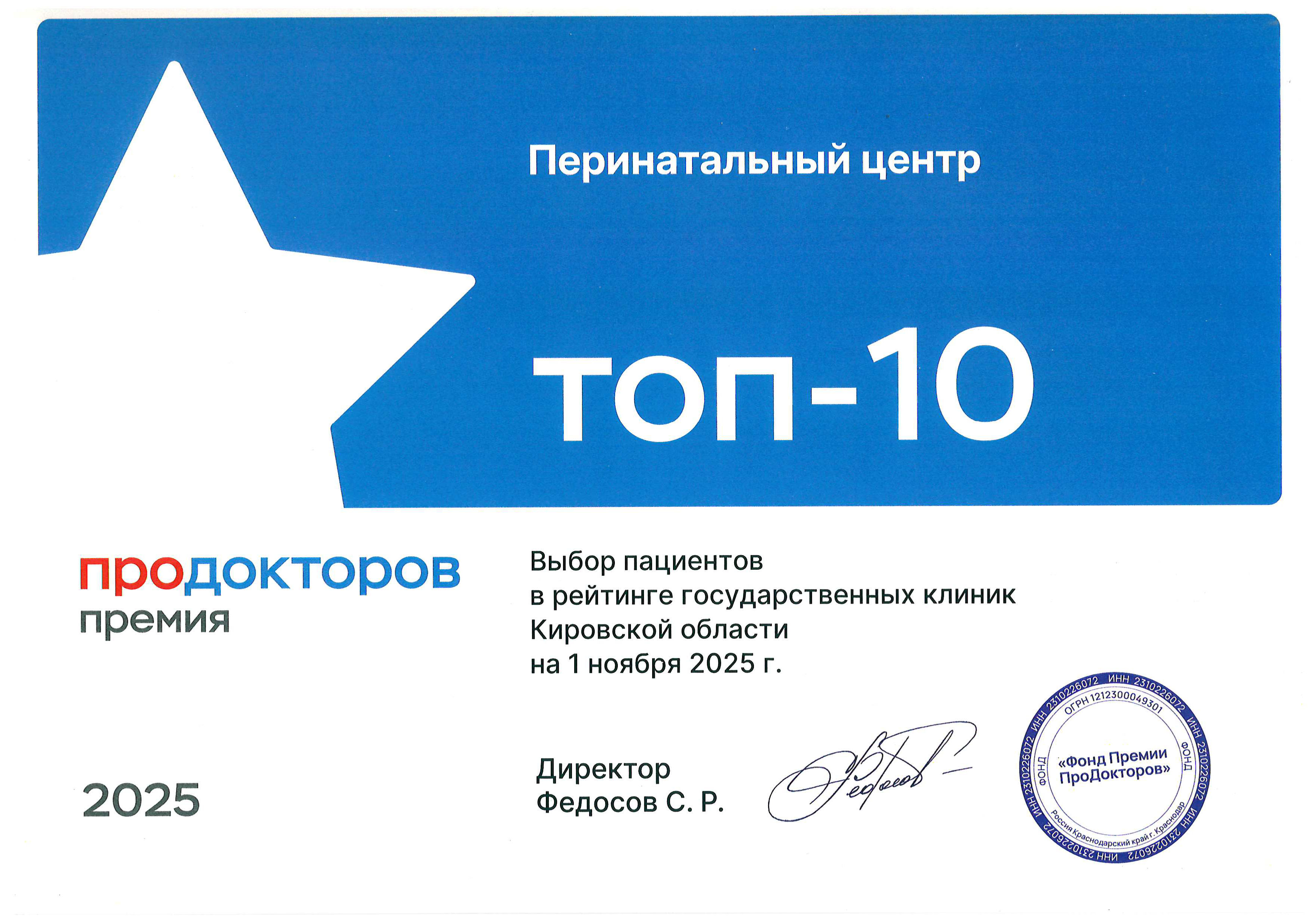 - Конкурс «Лучшая медицинская организация акушерско-гинекологического профиля Приволжского федерального округа — 2024» организован Междисциплинарной ассоциацией специалистов репродуктивной медицины (МАРС) совместно с журналом «StatusPraesens. Гинекология, акушерство, бесплодный брак» при поддержке главного внештатного специалиста по акушерству и гинекологии Минздрава РФ в Приволжском федеральном округе, доктора медицинских наук, профессора И.Ф. Фаткуллина.По итогам конкурса за высокое качество оказания медицинской помощи населению Кировский областной клинический перинатальный центр награжден дипломом II степени как «Лучший акушерский стационар – перинатальный центр ПФО.
